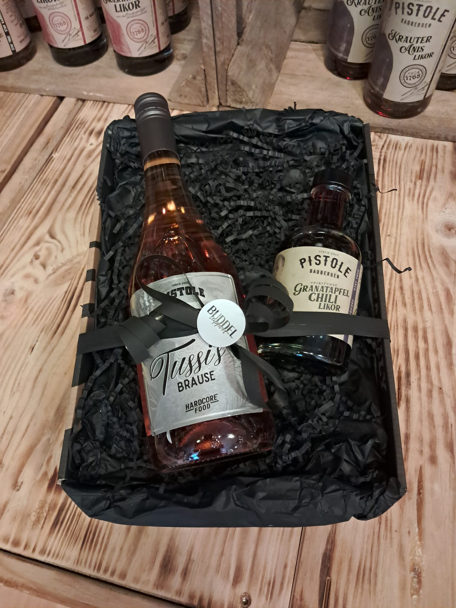 Präsentbox im Buddel-Support-Design, seidenmatt schwarz ausgekleidet.